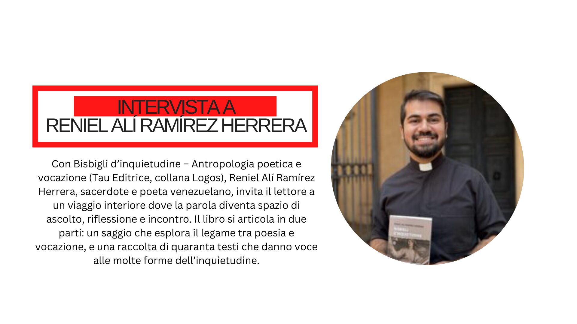 Con Bisbigli d’inquietudine – Antropologia poetica e vocazione (Tau Editrice, collana Logos), Reniel Alí Ramírez Herrera, sacerdote e poeta venezuelano, invita il lettore a un viaggio interiore dove la parola diventa spazio di ascolto, riflessione e incontro. Il libro si articola in due parti: un saggio che esplora il legame tra poesia e vocazione, e una raccolta di quaranta testi che danno voce alle molte forme dell’inquietudine. In questa conversazione, l’autore ci guida dentro le radici del suo pensiero poetico, tra fede, ricerca e silenzio.