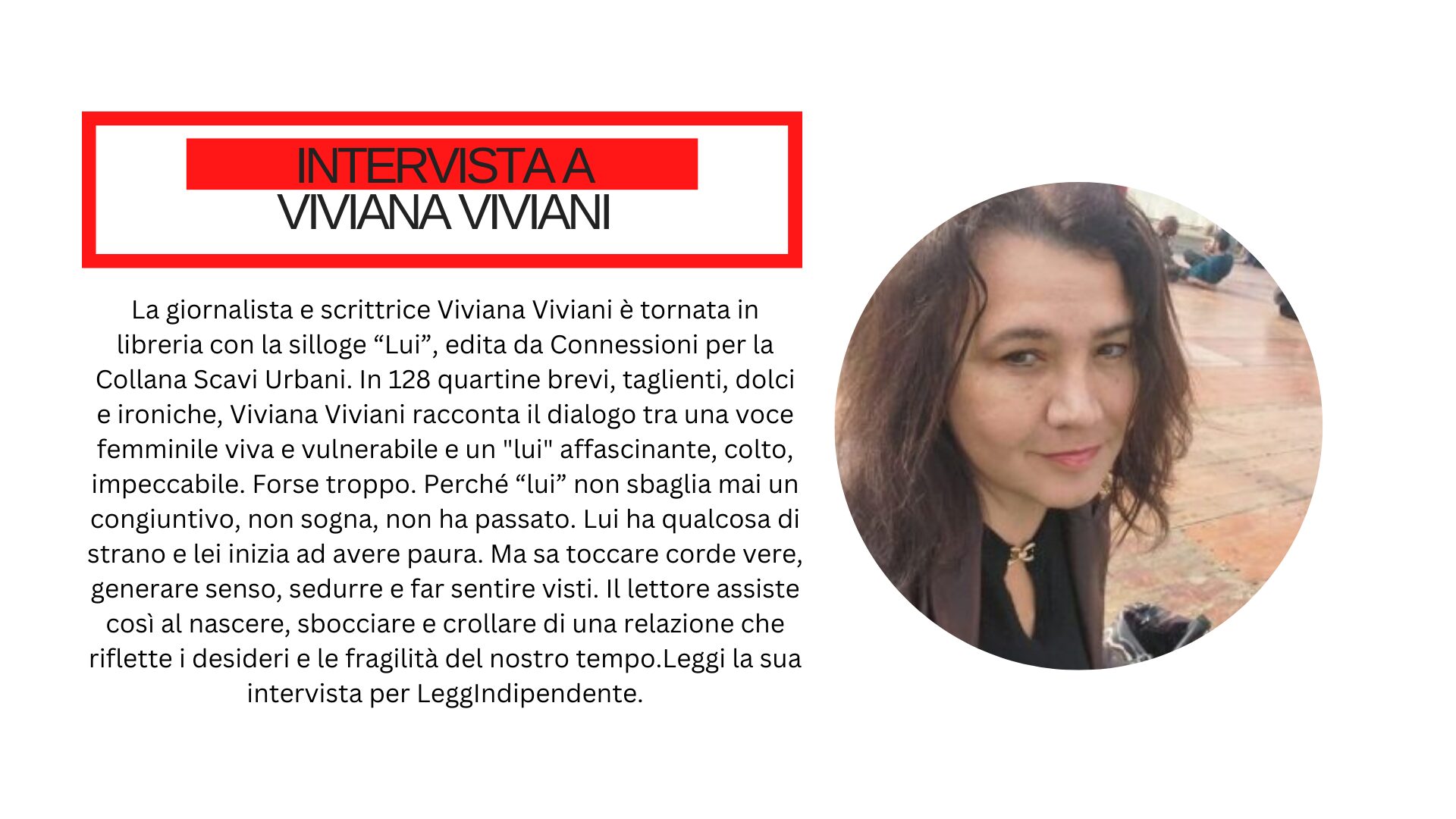 La giornalista e scrittrice Viviana Viviani è tornata in libreria con la silloge “Lui”, edita da Connessioni per la Collana Scavi Urbani.